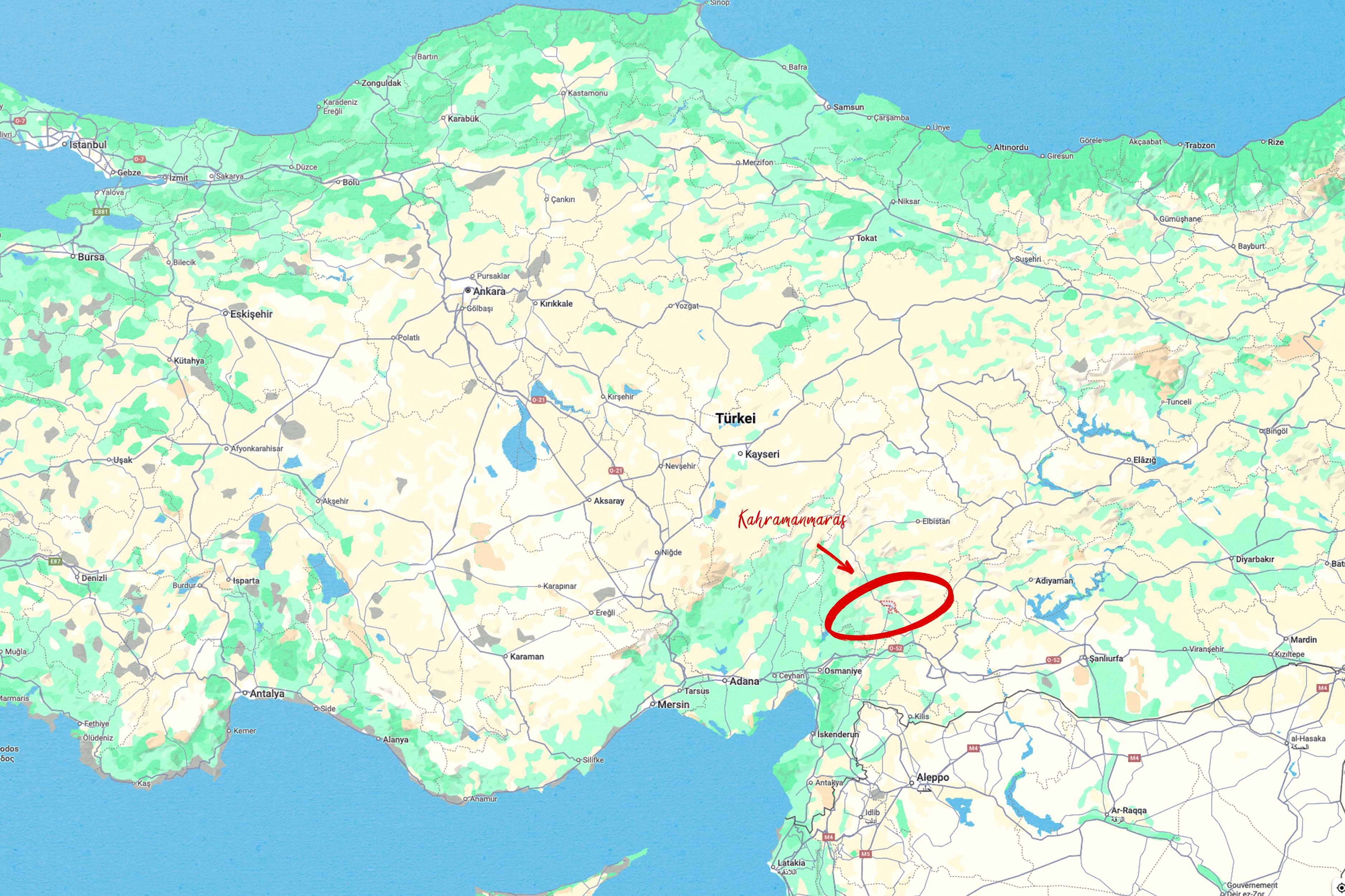 In der Region um die Stadt Kahranmanmaras wird die Baumwolle angebaut, die wir für unsere Kleidung verwenden. Wo das genau liegt, haben wir hier mal eingekreist: